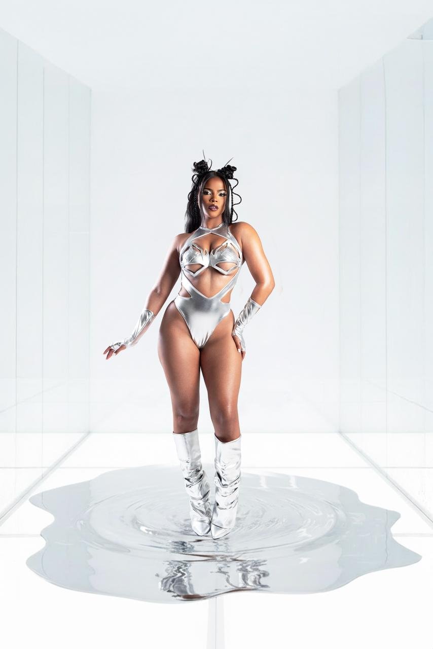 SYPHER, our coverage-friendly design for those who want support without sacrificing style. Metallic spandex wraps effortlessly around the body, paired with a structured chrome 3D-printed bra that delivers both edge and comfort.